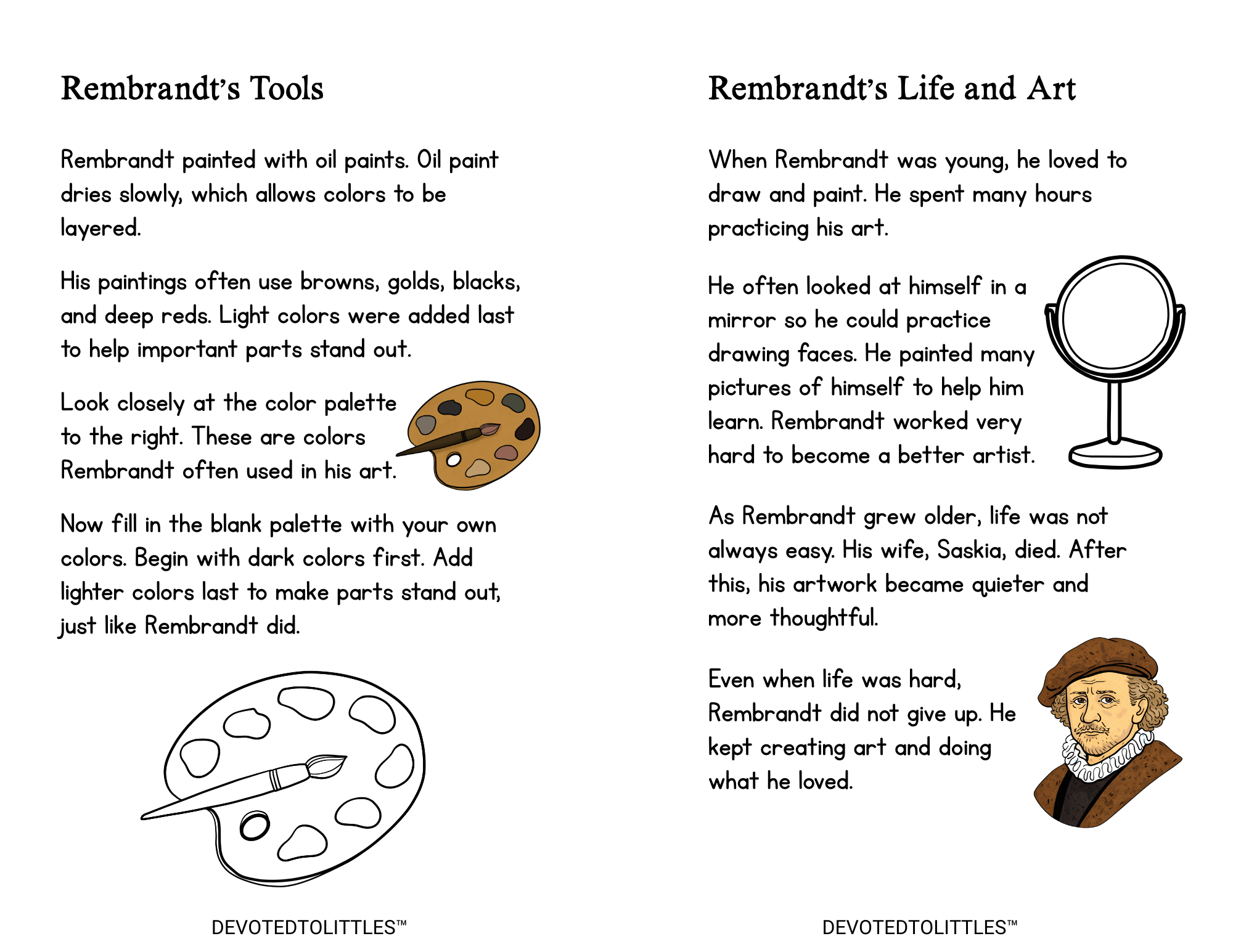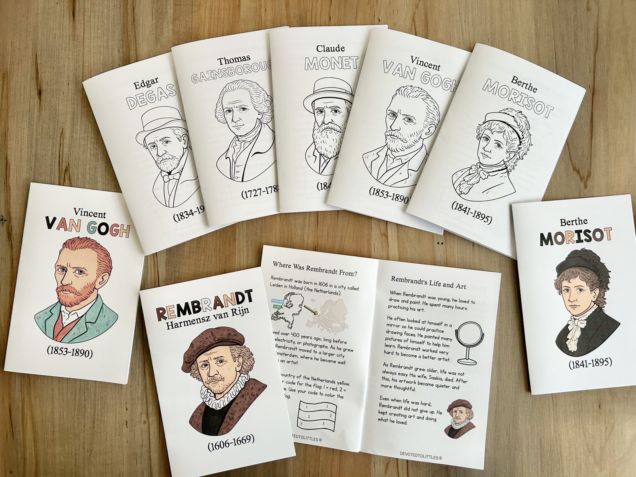 Each mini book introduces the artist through short, kid-friendly text and interactive pages. Children will explore where the artist lived, what made their art unique, and why their work is still remembered today. Every book also includes guided art activities, art detective prompts, famous works to study, and creative drawing and coloring pages that encourage children to observe carefully and create with confidence.