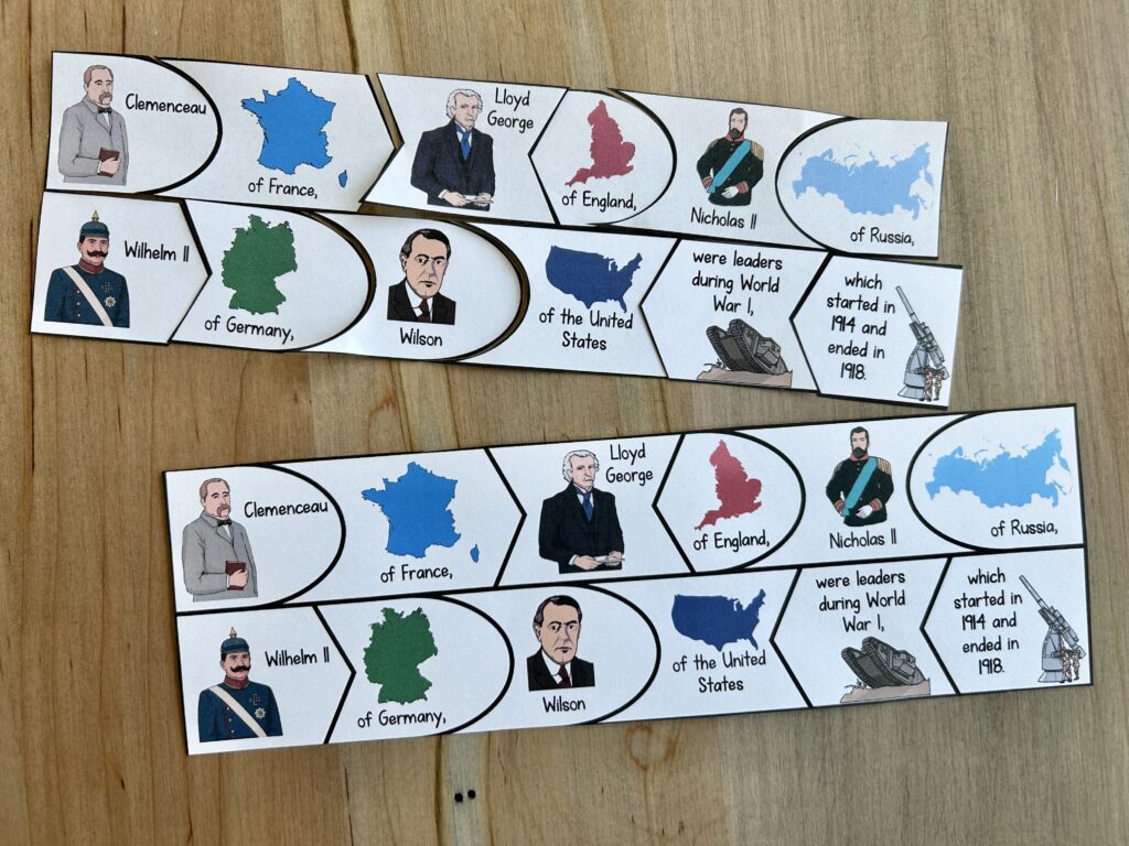 To make this lesson hands-on, we’ll use a World War I Leaders Puzzle activity while we listen to the history song (see my tutor video for this week’s tune). I’ll print and cut apart pictures of each leader along with their country’s flag. The kids will work to match each leader to the country they led as they put their puzzles together. You can download the PDF of this puzzle here.