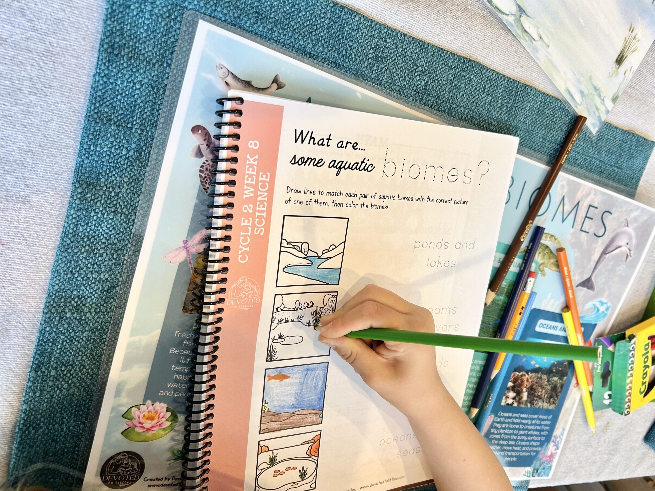 This week in science we learned about some aquatic biomes. My daughter enjoyed coloring the pictures of each type of aquatic biome and matching them to the correct names in her Cycle 2 Memory Work Activity Book. This hands-on activity really helped her connect the words with what each biome looks like.