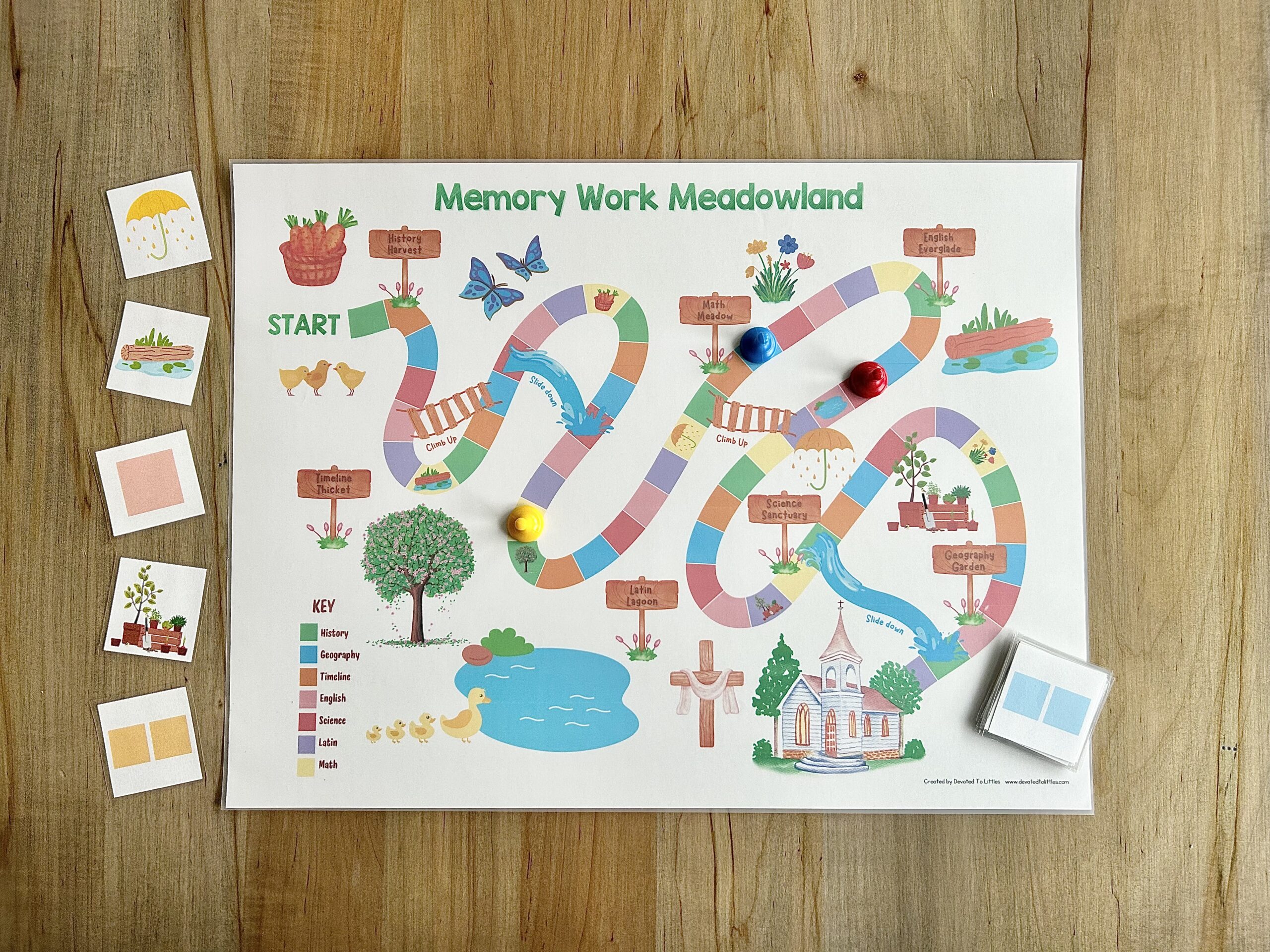 Review the CC memory work with this fun Easter/spring themed “candy-land” style board game!